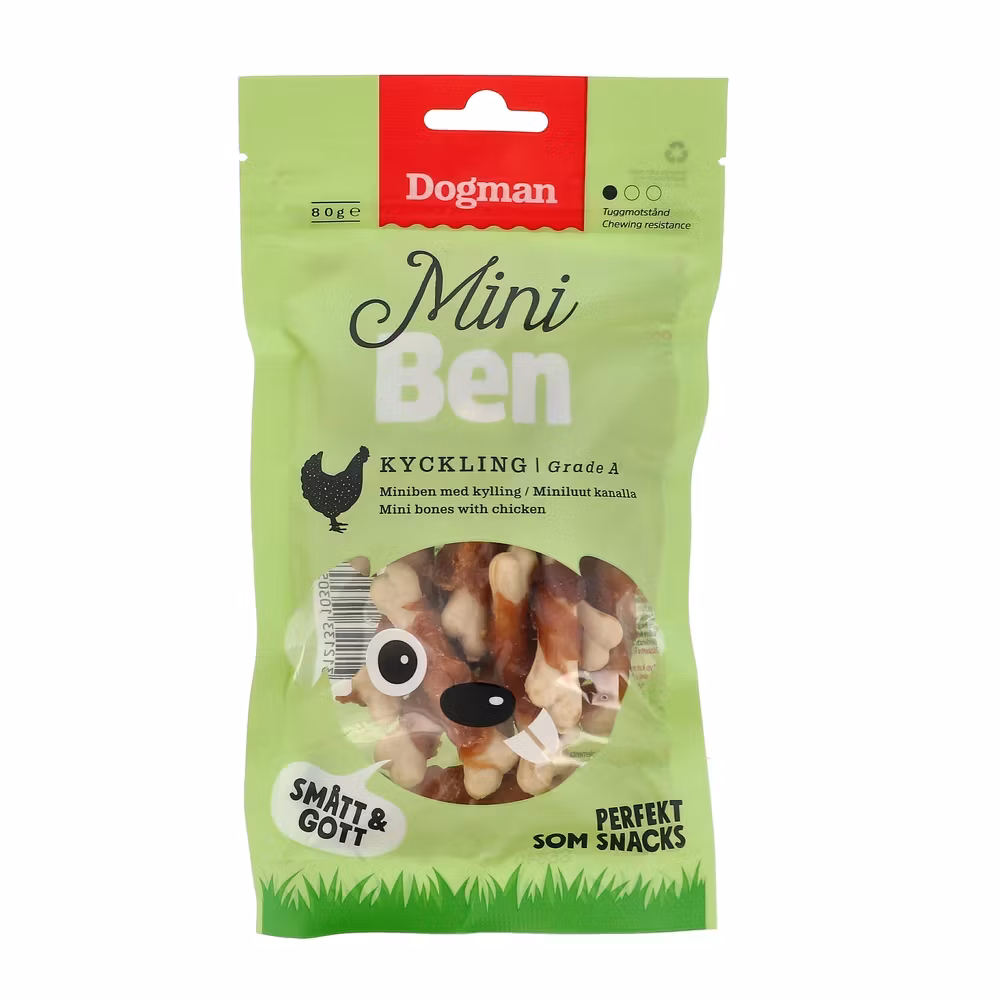 DOGMAN Mini Ben 44.90 SEK Produkten är tyvärr slut i lager. :( Bonuscard: 10% rabatt på hundmat! Är du medlem hos oss så registreras automatiskt dina köp hos oss. Eventuella rabatter återbetalas direkt efter ditt köp. Gäller ej kampanjvaror. Bli medlem idag! Alltid när du handlar hos Bow Wow Betala enkelt med Klarna faktura, kort, swish eller bankbetalning. Snabba leveranser från eget lager. Enkla byten och returer. Fri frakt över 599kr. Information Recensioner Välsmakande små tuggben med delikat kyckling lindat utanpå. Perfekt för kräsna hundar! Håll alltid hunden under uppsikt när den tuggar på tuggben. Lättare att tugga än jämntjocka hundtugg!Tillgodoser tuggbehovet och bidrar till en sund tandhälsa.Med Grade A-kyckling.Storlek XS: 6.5 cm. Vikt: 80 g.