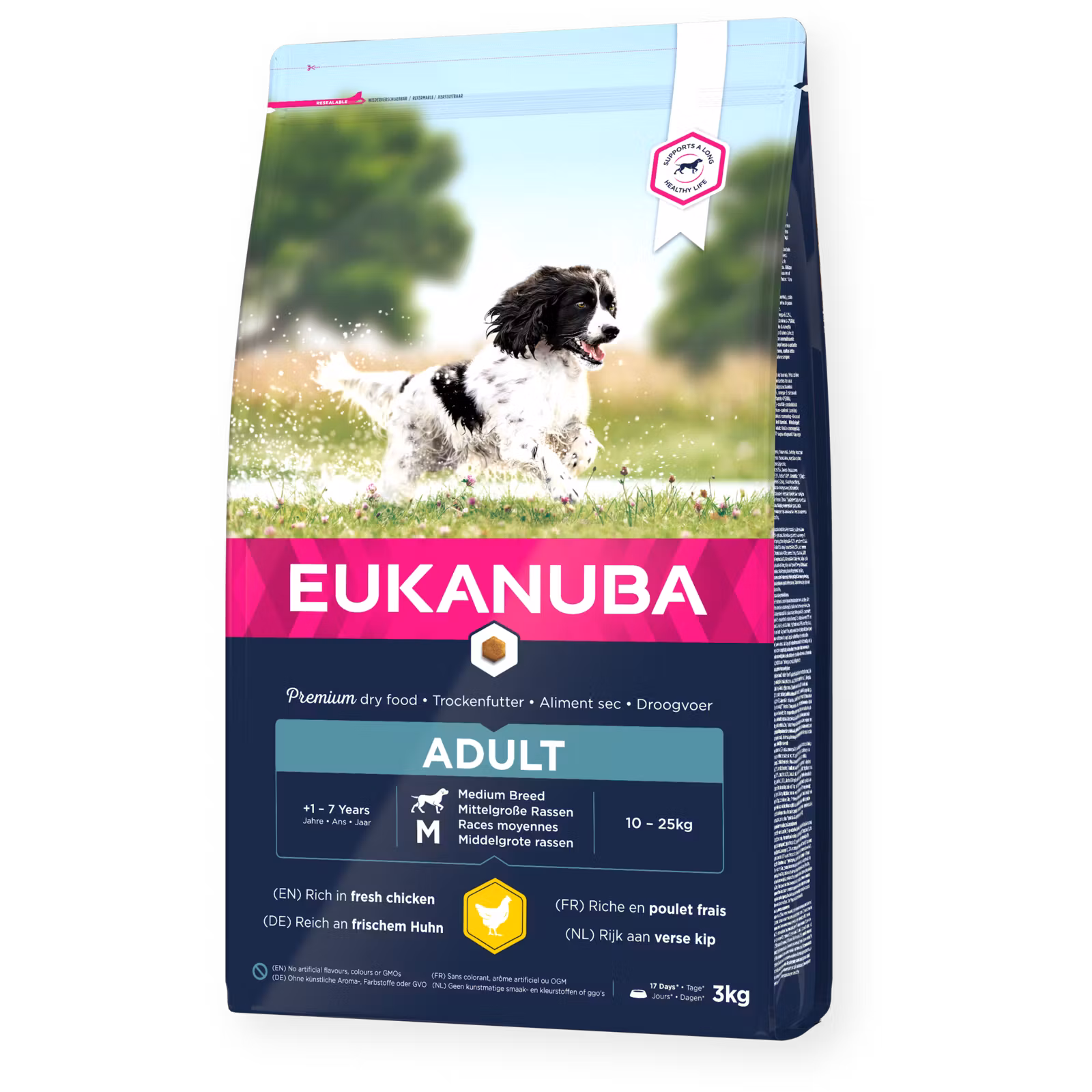 EUKANUBA Adult Medium Breed Fresh Chicken 299.00 SEK Produkten är tyvärr slut i lager. :( Bonuscard: 10% rabatt på hundmat! Är du medlem hos oss så registreras automatiskt dina köp hos oss. Eventuella rabatter återbetalas direkt efter ditt köp. Gäller ej kampanjvaror. Bli medlem idag! Alltid när du handlar hos Bow Wow Betala enkelt med Klarna faktura, kort, swish eller bankbetalning. Snabba leveranser från eget lager. Enkla byten och returer. Fri frakt över 599kr. Information Recensioner Eukanuba Adult Medium Breed är ett torrfoder rikt på färsk kyckling. Speciellt anpassat för vuxna hundar av medelstor ras från 1 till 7 år.Med L-Karnitinet som hjälper till att minska kroppsfett och hjälper din hund att bibehålla en optimal vikt, vilket bidrar till mindre belastning på lederna. Den skräddarsydda fiberblaningen med prebiotisk FOS och betmassa främjar dessutom en hälsosam matsmältning.Naturliga källor till omega-6 och omega-3 för frisk hud och päls.Särskild form på foderbitarna och unik DentaDefense-teknik bidrar till att hålla tänderna rena och friska.Antioxidanterna E- och C-vitamin för att bidra till att stödja immunförsvaret.L-karnitin för att bidra till naturlig fettförbränning.Prebiotisk FOS & betmassa för att stödja en sund matsmältning.För hundar mellan 10-25 kg.