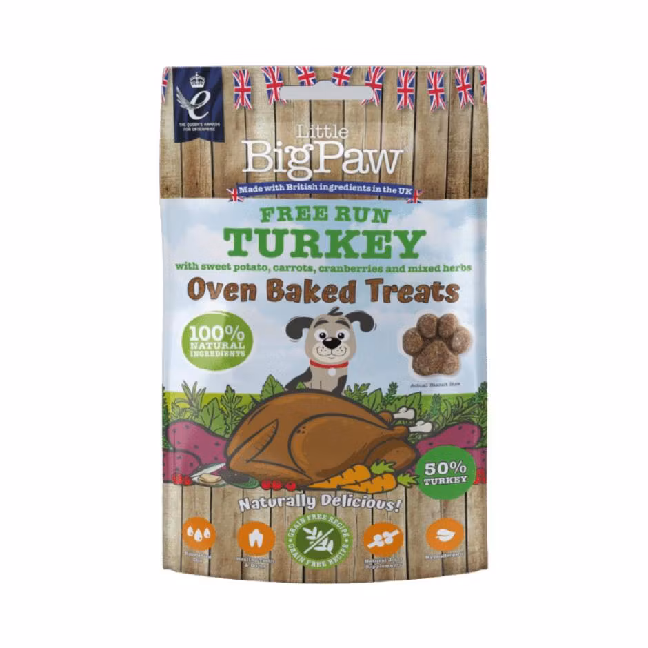 LITTLE BIGPAW Oven Baked Treats Turkey 49.00 SEK Produkten är tyvärr slut i lager. :( Bonuscard: 10% rabatt på hundmat! Är du medlem hos oss så registreras automatiskt dina köp hos oss. Eventuella rabatter återbetalas direkt efter ditt köp. Gäller ej kampanjvaror. Bli medlem idag! Alltid när du handlar hos Bow Wow Betala enkelt med Klarna faktura, kort, swish eller bankbetalning. Snabba leveranser från eget lager. Enkla byten och returer. Fri frakt över 599kr. Information Recensioner Little BigPaw Oven Baked Treats med kalkon, potatis, morötter, tranbär och örter – ett utsökt och näringsrikt hundgodis för alla tillfällen.De här läckerheterna ugnsbakas i vedeldade, koldioxidneutrala ugnar på den engelska landsbygden och är fullpackade med hälsosamma ingredienser som din hund kommer att älska.Fyllda med näring och god smak! Innehåller grönläppad musla och MSM som stödjer god ben- och ledhälsa.Minst 50 % brittisk kalkon.Naturliga kolhydrater i form av sötpotatis och kikärtor.Rikt på fibrer och essentiella fettsyror.100 % naturliga och lättsmälta ingredienser.Knapriga snacks som verkar förebyggande mot tandsten.Fritt från konstgjorda tillsatser, spannmål och gluten.130 g.