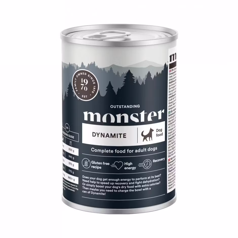 MONSTER Dynamite 400 g 49.00 SEK Produkten är tyvärr slut i lager. :( Bonuscard: 10% rabatt på hundmat! Är du medlem hos oss så registreras automatiskt dina köp hos oss. Eventuella rabatter återbetalas direkt efter ditt köp. Gäller ej kampanjvaror. Bli medlem idag! Alltid när du handlar hos Bow Wow Betala enkelt med Klarna faktura, kort, swish eller bankbetalning. Snabba leveranser från eget lager. Enkla byten och returer. Fri frakt över 599kr. Information Recensioner Får din hund tillräckligt med energi för att orka prestera på topp? Eller behöver du boosta torrfodret med extra kalorier. Och hjälpa till med återhämtning och vätskebalans. Då kanske du behöver ladda din hund med en burk Dynamit, kort och gott!Premiumfoder med smaklig kyckling.Passar perfekt för att boosta fodret.Kan även ges för extra energi.Hjälper till med återhämtning och vätskebalansen.Svenskt recept.