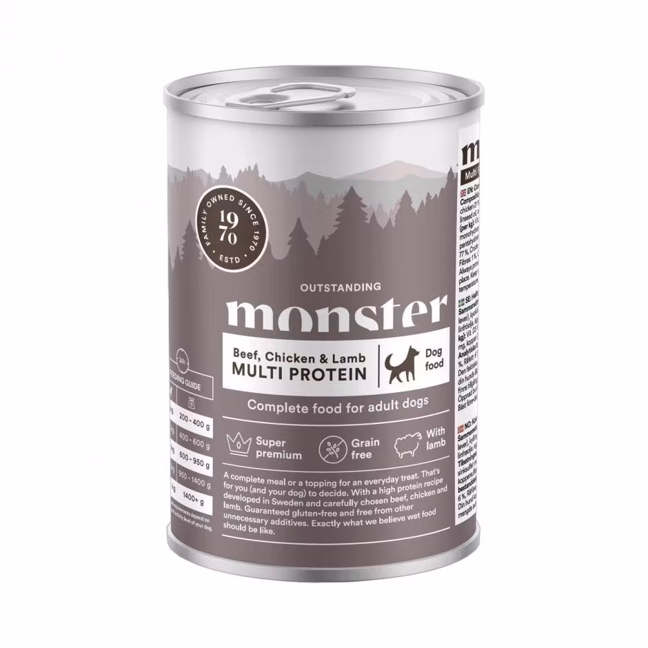 MONSTER Multi Protein Beef, Chicken & Lamb 400 g 49.00 SEK Produkten är tyvärr slut i lager. :( Bonuscard: 10% rabatt på hundmat! Är du medlem hos oss så registreras automatiskt dina köp hos oss. Eventuella rabatter återbetalas direkt efter ditt köp. Gäller ej kampanjvaror. Bli medlem idag! Alltid när du handlar hos Bow Wow Betala enkelt med Klarna faktura, kort, swish eller bankbetalning. Snabba leveranser från eget lager. Enkla byten och returer. Fri frakt över 599kr. Information Recensioner Blötmat med en näringsrik blandning av välsmakande nötkött, kyckling och lamm. Komplett måltid eller bara lite guldkant på vardagen. Det bestämmer du (och din hund). Vårt recept är framtaget i Sverige med noggrant utvalda ingredienser – fritt från onödiga tillsatser! Precis så som vi tycker att en blötmat ska vara.Multiprotein.Utan onödiga tillsatser.100% spannmålsfri.Svenskt recept.