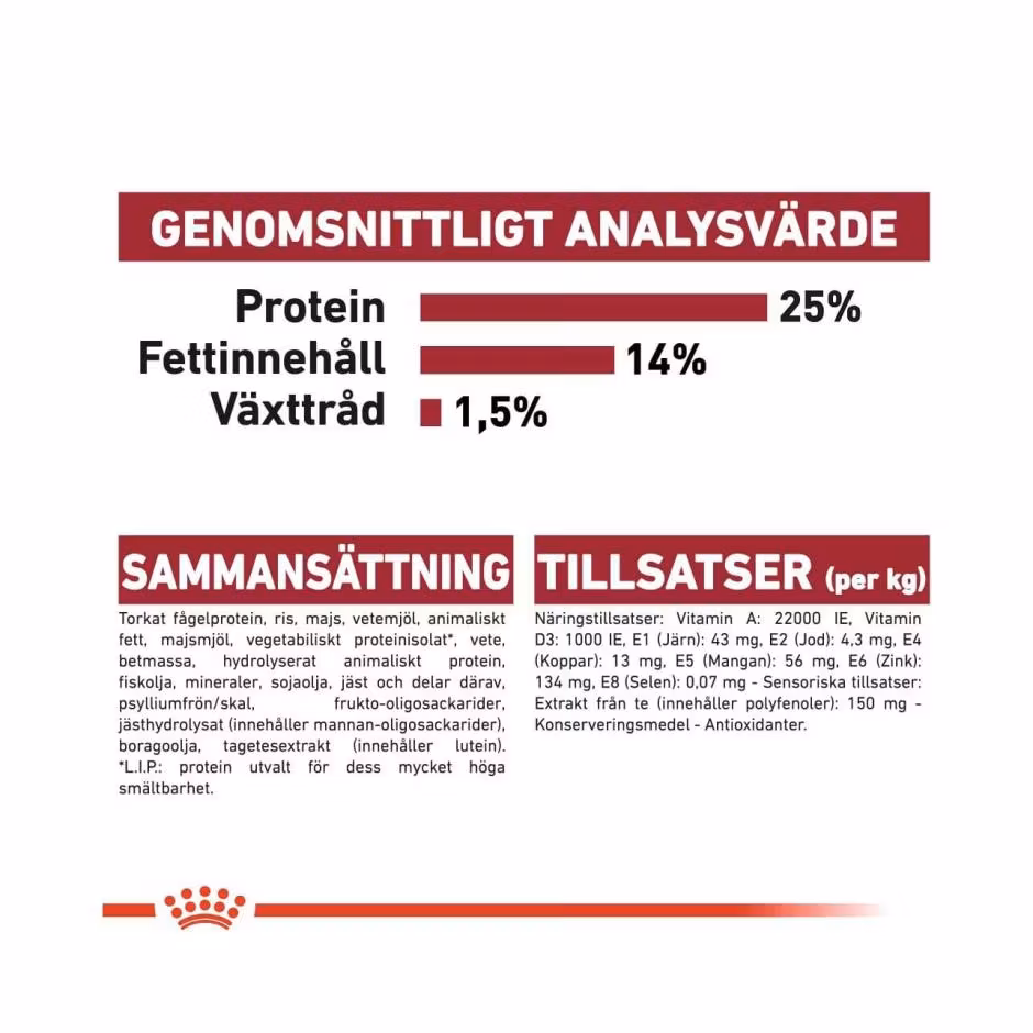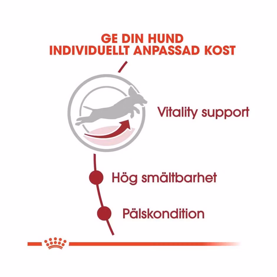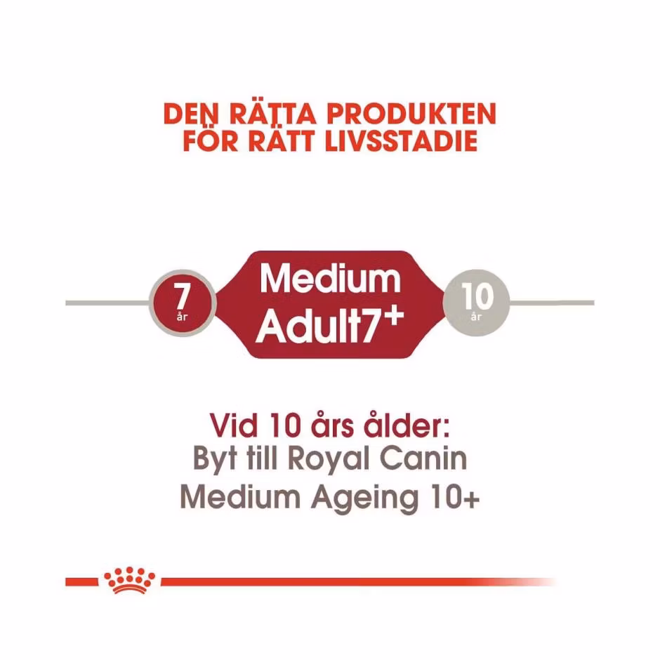 ROYAL CANIN Medium Adult 7+ 249.00 SEK Produkten är tyvärr slut i lager. :( Bonuscard: 10% rabatt på hundmat! Är du medlem hos oss så registreras automatiskt dina köp hos oss. Eventuella rabatter återbetalas direkt efter ditt köp. Gäller ej kampanjvaror. Bli medlem idag! Alltid när du handlar hos Bow Wow Betala enkelt med Klarna faktura, kort, swish eller bankbetalning. Snabba leveranser från eget lager. Enkla byten och returer. Fri frakt över 599kr. Information Recensioner ROYAL CANIN® Medium Adult 7+ torrfoder har ett anpassat innehåll av näringsämnen för att bibehålla vitaliteten hos medelstora hundar, när de första tecknen på åldrande visar sig.Dessutom innehåller det ett komplex av antioxidanter som bidrar till att neutralisera fria radikaler och därigenom skydda viktiga molekyler i din hunds kropp.ROYAL CANIN® Medium Adult 7+ bidrar till att stödja optimal smältbarhet med en exklusiv näringssammansättning, inklusive ett balanserat tillskott av kostfiber och en optimal mängd mycket högkvalitativt protein.Helfoder för äldre hundar av medelstora raser.Omega-3-fettsyror främjar hälsosam hud och glansig päls.Bidrar till att stödja optimal smältbarhet.Optimal mängd mycket högkvalitativt protein.Anpassat innehåll av näringsämnen för att bibehålla vitaliteten.